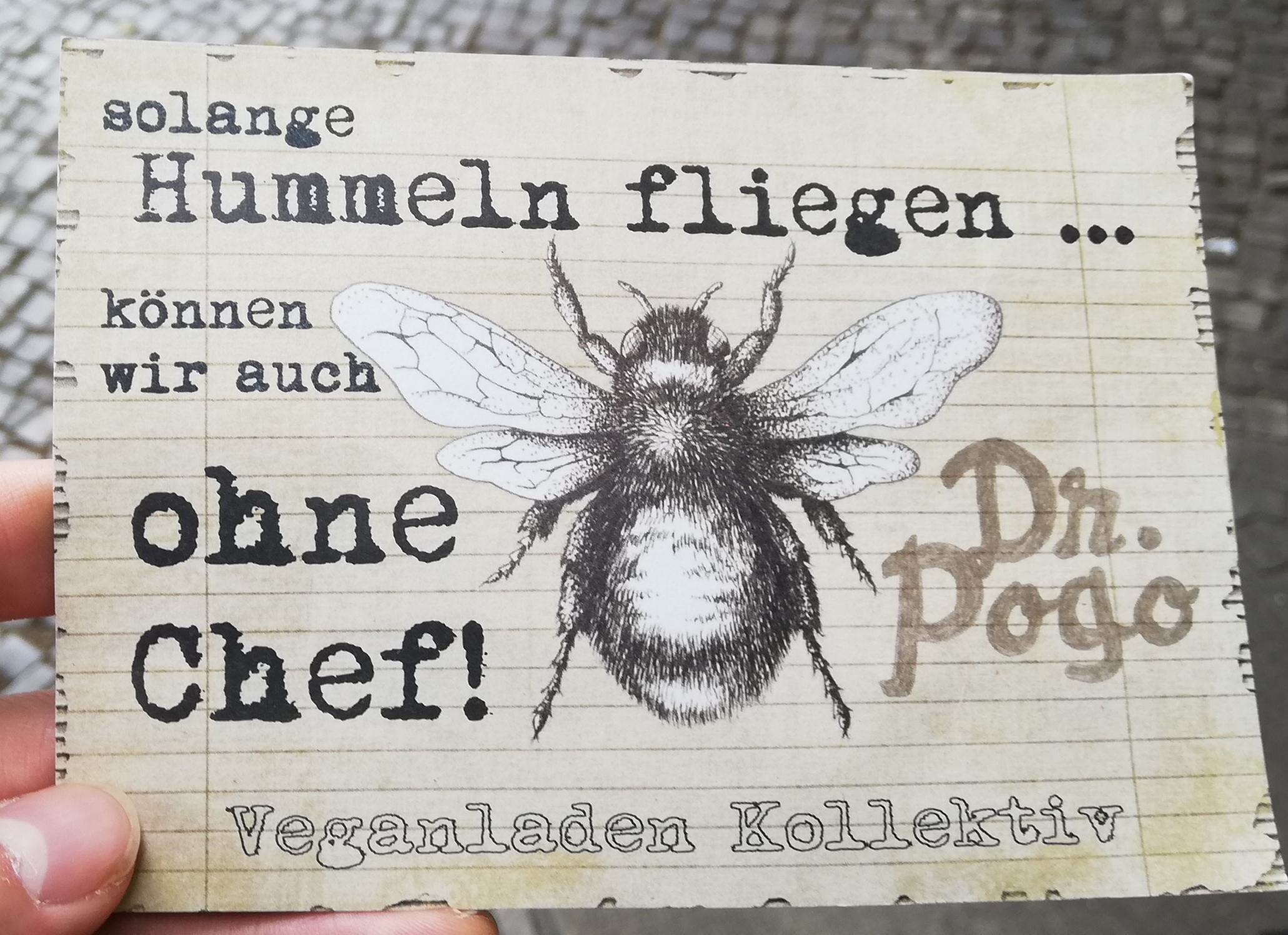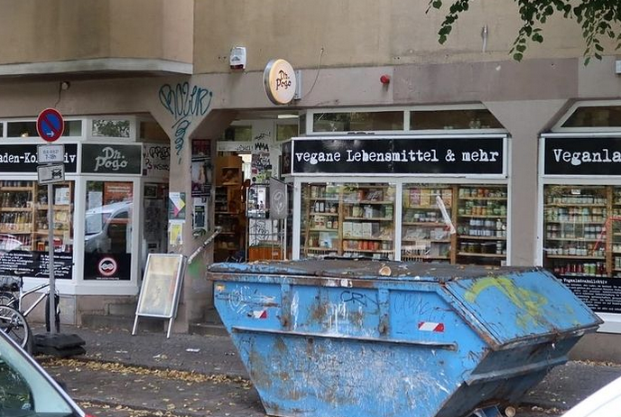 Het was in ieder geval erg leuk om hen te bezoeken. Na het bekijken van de winkel gingen we naar hun kleine magazijn, dat de uitvalsbasis is van Gemein Vertrieb Ook werden we getrakteerd op erg lekkere koffie van een lokale coöperatie, en toen zagen we nog wat plaatselijk geproduceerde tofu binnenkomen – bezorgd op de fiets! Ga er ff langs als je eens in Berlijn bent. De Dr Pogo-winkel bevindt zich op de toepasselijke genaamde Karl-Marx-Platz in de relaxte wijk Neukölln. Naast de dagelijkse boodschappen kun je er ook een kop koffie of thee halen en op een bankje op het nabijgelegen pleintje of parkje chillen. (Update: helaas bestaat Gemein Vertrieb niet meer. Er is wel een soort doorstart onder de naam KoMa. Wij verkopen daar momenteel geen producten van, omdat we rechtstreeks zijn gaan inkopen bij VioMe, Actyva en SCOP-TI. Dr Pogo bestaat trouwens nog wel, dus daar kan je nog steeds langs gaan!).