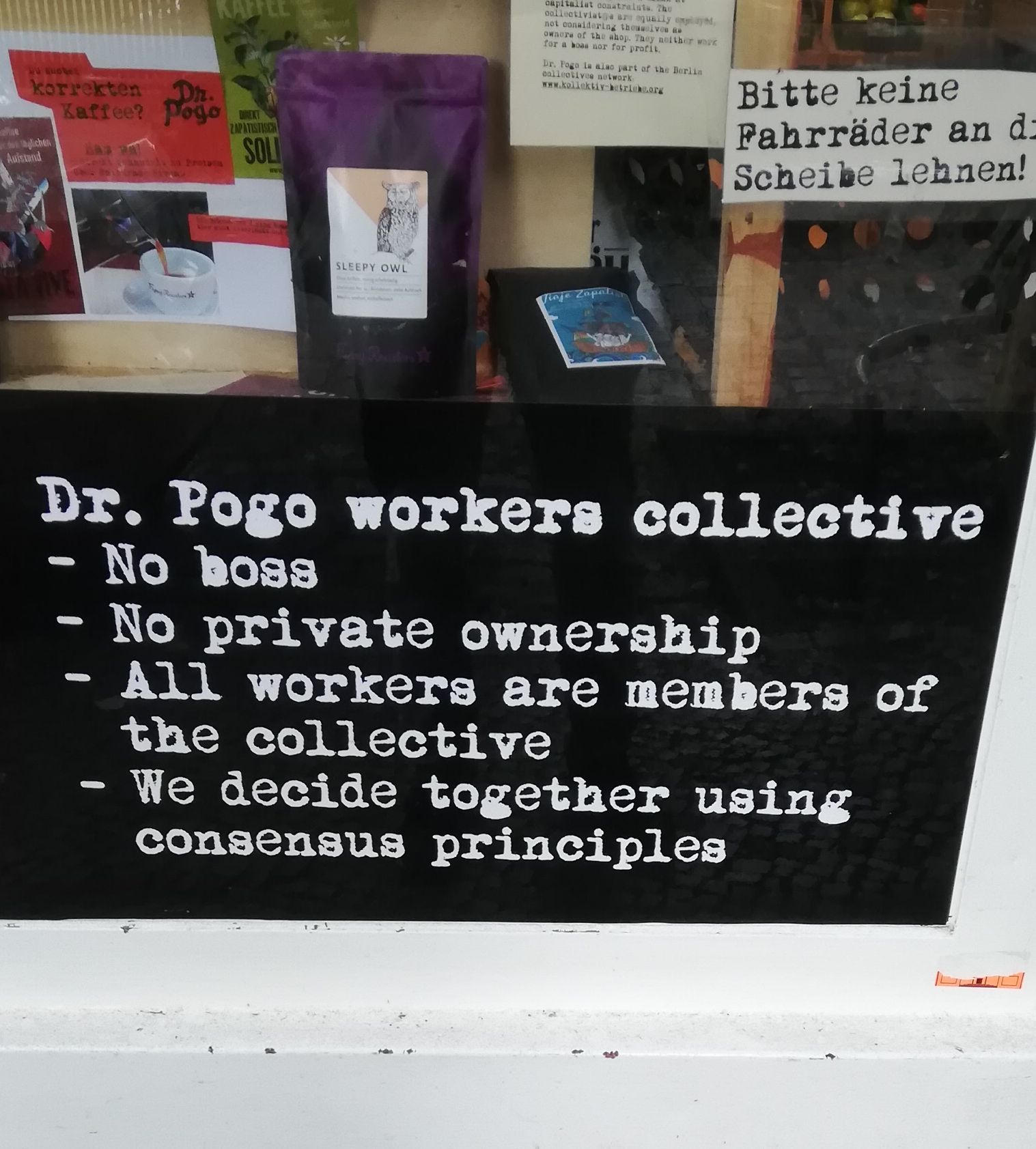 Ook zijn we op bezoek geweest bij Dr Pogo / Gemein Vertrieb in Berlijn, onze andere hoofdleverancier. Dr Pogo is een collectief gerunde veganistische en biologische winkel, volgens principes van consensus en gelijkheid onder de deelnemende werkers. Een van hen gaf ons een rondleiding door de winkel en het andere project dat door hen is opgericht, Gemein Vertrieb. Hij legde uit dat het doel van Dr Pogo is om een volledig assortiment van producten aan te bieden, op de meest ethische manier. Dit betekent dat veel producten in hun winkel van bedrijven zijn met een ‘normale’ eigendoms- en managementstructuur (maar die organisch zijn en een vooruitstrevend beleid voeren). Het expliciete doel van Geimein Vertrieb is aan de andere kant het promoten van het idee en de praktijk van wat wij “vrije bedrijven” zouden noemen, waar de werkers en/of kleine boeren samen beslissen over de weg, de inhoud en het doel van hun werk . Zoals bij Dr Pogo zelf! We vonden deze dubbele structuur (dr pogo/gemein vertrieb) een interessante manier is om pragmatisme en idealisme te combineren!